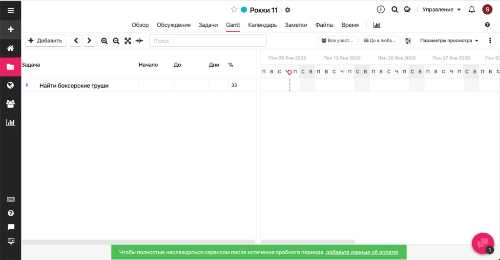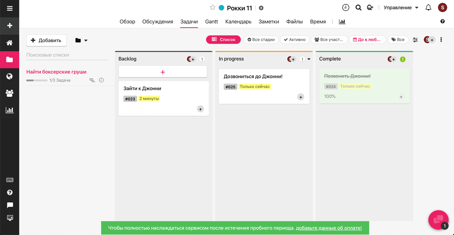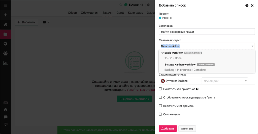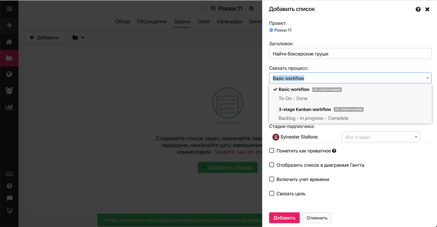 Далее внутри проекта и появляются настоящие инструменты для менеджмента. Для того, чтобы снять фильм про Рокки, нам точно понадобится много боксерских груш. Так что создаем задачу, ставим галочку на трехступенчатом канбане, на диаграмме Гантта и ждем, когда все будет выполнено.