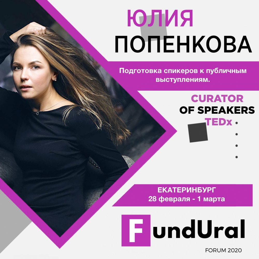 В воскресенье, 1 марта, в 16.30 Юлия Попенкова проведет лекцию «Подготовка спикеров к публичным выступлениям» на четвертом практикоориентированном форуме «Фандрайзинг на Урале».