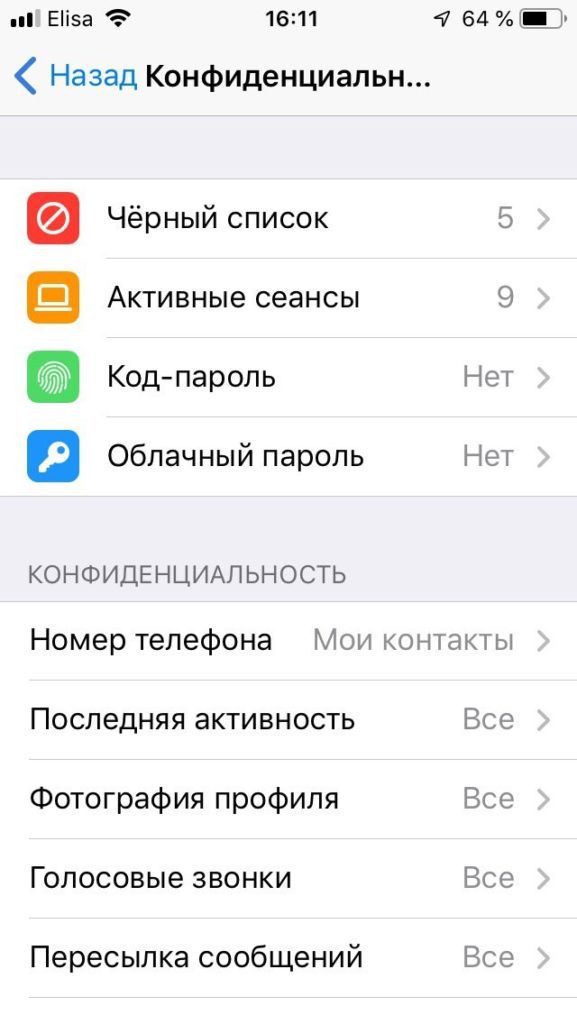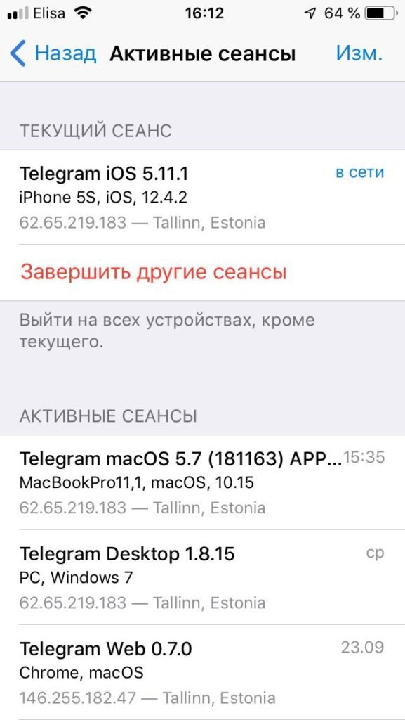 С черным списком все, надеемся, понятно без наших объяснений. Далее видим «Активные сеансы». На скриншоте видно, что прямо сейчас «телега» функционирует на любимом редакционном iPhone 5S, а еще на куче Apple-устройств разной степени тяжести, ибо автор этой статьи любит Apple. Если какое-то из устройств вам незнакомо, то, скорее всего, это был какой-нибудь мошенник и плут, либо старый добрый товарищ майор — тогда завершайте все неизвестные вам сеансы и меняйте пароль.