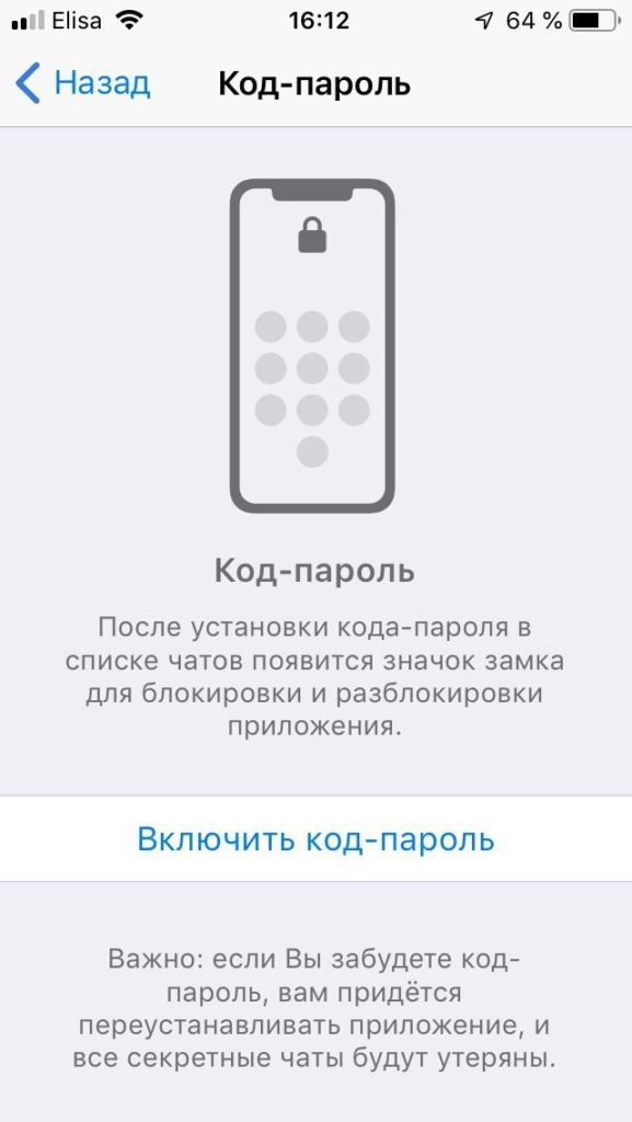 Выходим из сеансов и приступаем к, не побоимся этого слова, запароливанию вашего Telegram. Сначала включаем код-пароль, что является обычным пин-кодом к вашим секретным чатам (о них позже).
