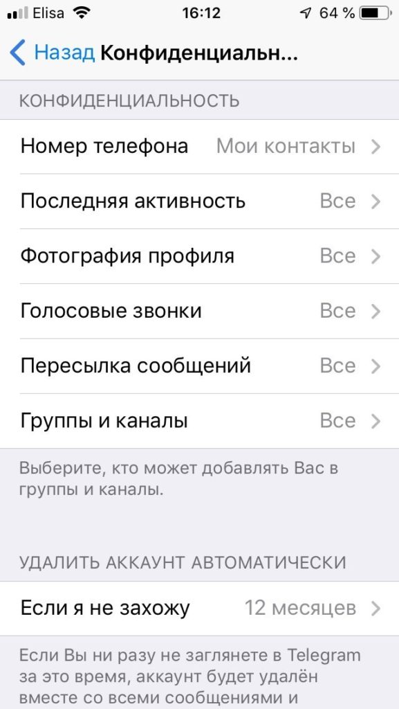 Да, последним пунктом на картинке выше идет отличная функция, навеянная фразами из голливудских блокбастеров: «Если я не вернусь через 10 минут, скажите Джоди, что я ее люблю!». Да, есть возможность настроить автоматическое удаление Telegram-аккаунта, если вы не заходили в систему определенное время. Отличная шпионская функция, не правда ли?