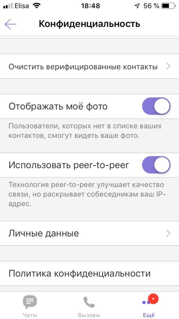 Жмем на «Конфиденциальность» и попадаем в достаточно бедные настройки этой самой конфиденциальности. И там есть два очень важных ползунка. Первый из них — «Использовать Peer-to-Peer». Если вы созваниваетесь по Вайберу только с друзьями и родственниками, то сюда можно не нажимать. Но вот для любых других звонков эта галочка очень опасна, ведь через ваш IP, которым вы в таком случае поделитесь, можно узнать очень много важной информации.