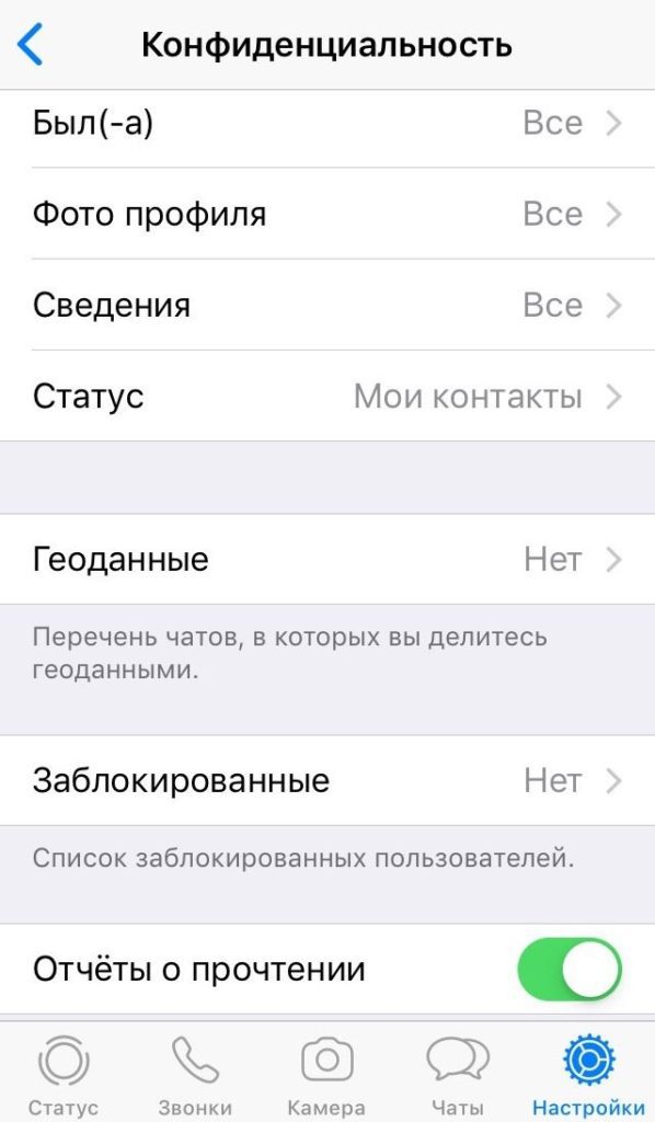 Давайте начнем с настроек конфиденциальности. Они никак не влияют на безопасность ваших личных данных, зато демонстрируют то, какой вы интроверт и мизантроп. Здесь вы выбираете, что демонстрировать товарищу майору другим пользователям: когда вы в последний раз были в сети, ваше фото, «о себе», статус и отчеты о прочтении сообщения. Все эти функции работают по принципу «око за око» — если ваш начальник не видит, когда именно вы заходили в мессенджер и прочитали ли его грозное сообщение, то и вы не будете видеть все это у начальника.