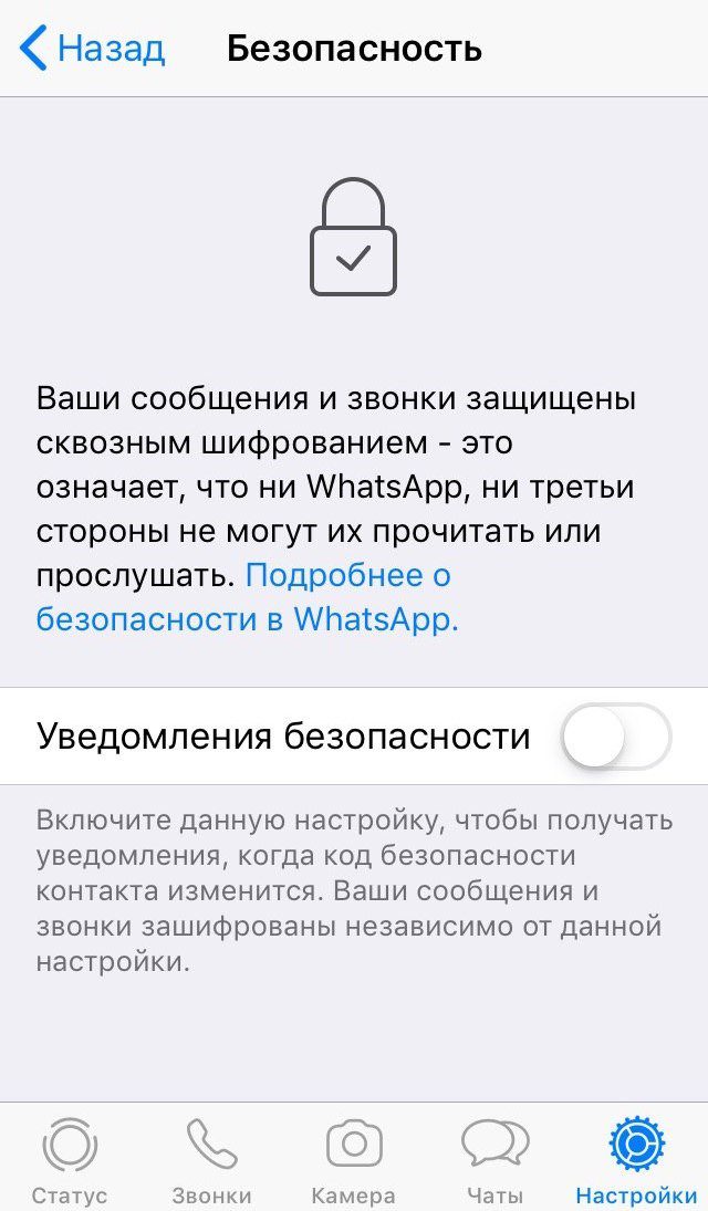 Дальше возвращаемся на шаг назад и заходим в «Безопасность». Там мы видим информацию о том, что WhatsApp придумал всю безопасность и без вашего скромного участия, поэтому вам даже не стоит об этом заботиться. Ну или, если хотите, можете включить себе уведомления о смене шифровального ключа, которое вы вряд ли когда-нибудь получите.