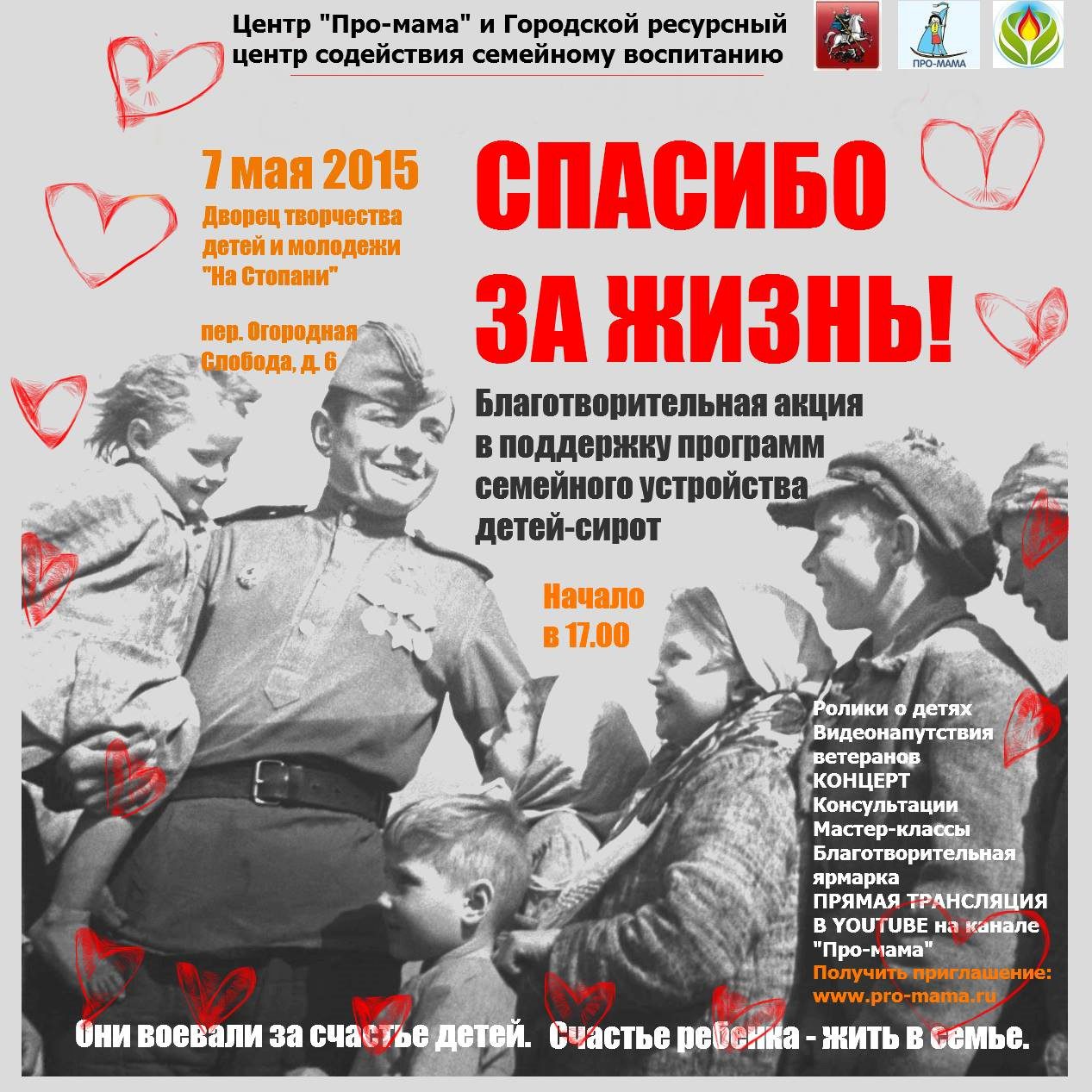 Оказывается, практически любая акция, которую можно приурочить ко Дню Победы, обрастает своими идеями, смыслами и настроением. Взять хотя бы акцию центра «Про-Мама» под названием «Спасибо за жизнь», которая была проведена 7 мая 2015 года. Это благотворительная акция в поддержку программ семейного устройства детей-сирот. На сцене выступил Петр Налич, проводились консультации и мастер-классы, а еще были продемонстрированы видеоролики с напутствиями от ветеранов. Слоганом мероприятия стало «Они воевали за счастье детей. Счастье ребенка — жить в семье».