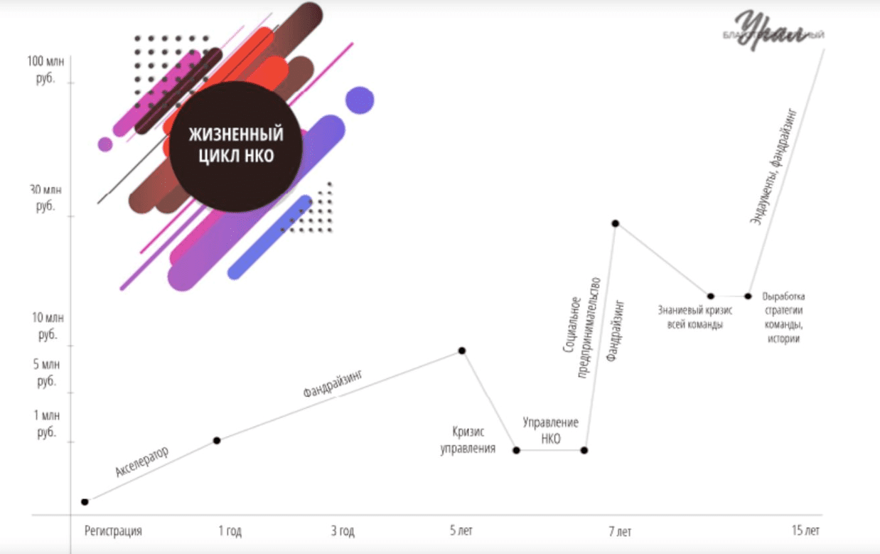 И снова удобная и грамотно составленная инфографика побеждает обезжиренный и безглютеновый текст. Виктория Щелкова предельно понятно описала весь жизненный цикл практически любой НКО, нарисовав вот такую схему: